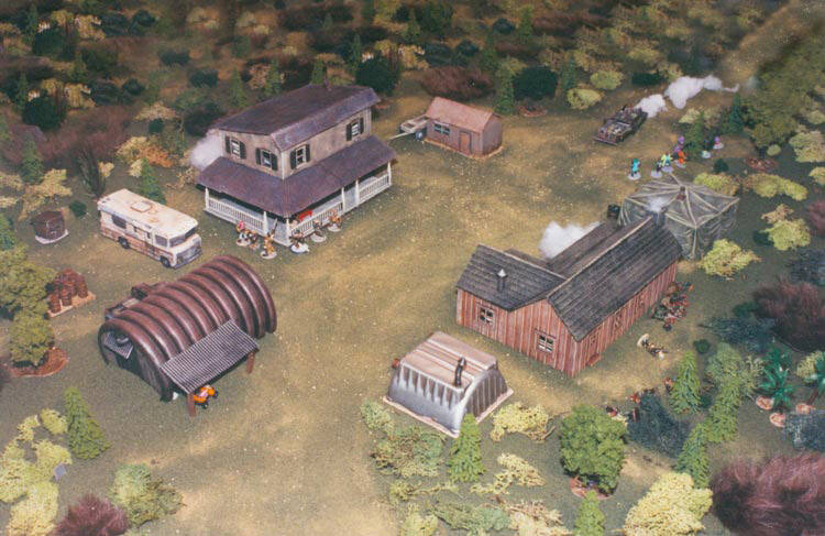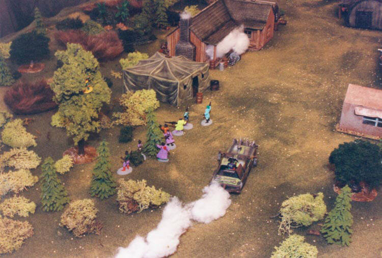 "Black Water Hattie lived back in the Swamp, where the big green reptiles dwell...." This set of pics is from one of our earliest games, the "Fast Eddie's River Pirates" Scenario. The bottom shows Eddie's allies charging in with the "SuperCaddy" to help out. The Russian forces won the day, and fast Eddie and his bunch of psychotics were given the Hard Goodbye. The Russkies rescued a captured alien Psionicist, and got to retain her as a campaign asset. Good thing, too, as the southern Florida region is rife with rumors of witches, Psionicist enclaves, etc.... |