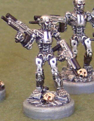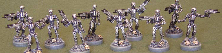 It is presently very fashionable to not use any metallic paints when painting metal surfaces on miniatures. Base colors are blended from dark to light to achieve a "metal" effect artistically rather than relying on the easier technique of using metallic paints. The picture to the left illustrates that with practice, metallic painted can be stained and blended to achieve a very high-quality chromed effect. The figures are the old Terminator Endoskeletons from the now-defunct Leading Edge Games. |