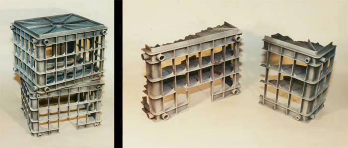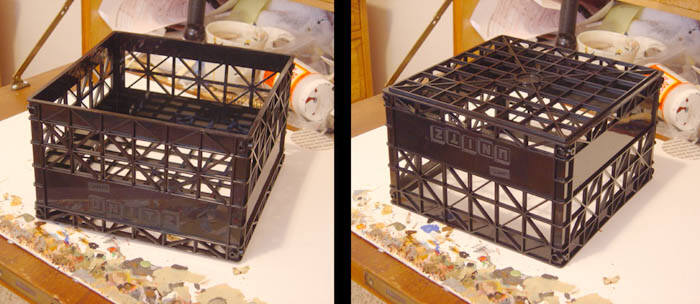 Here's a nifty little trick to really urbanize your game setup a LOT. In conjunction with the home-made rubble illustrated in another article on this page, you'll be hard-pressed to come up with something better for as little money. Soon you'll have highrises in various stages of ruin, stackable on top and expandable to the side - perfect for urban warfare! You basically need to find yourself a good looking "shell" for a building. The best and cheapest that I've found are the cheapie plastic "storage crates". I've found them in dollar stores, office supply stores, (shudder!) Wal-Mart, grocery stores, etc. They range in size from small to large. The best ones are molded in black plastic, I'll explain why in a moment. So let's get started! Scale Model Highrises from Plastic Storage Crates Well, I guess it's not much to look at, huh? Kinda useless for gaming other than to store magazines in. But.... wait a minute.... turn it upside-down! Hmm.... that does kinda look like a modern office building shell after all! Wow wasn't that easy? NOW how much would you pay? BUT WAIT....THERE'S MORE!!! A little deft work with the hacksaw, and a useable doorway shows up. Needless to say, if you're gonna use multiples of these to make higher stories, you'll want a few boxes with no doorway cut out. Spray paint the 'model' with gray auto primer. Use only a downward angle as depicted above. Remember when I said that the black ones are the best? That's because if you use a downward angle with the auto primer, the ridges sticking out will not have any paint below them, creating a grungy looking artificial shadow. It's another trick to make your models and game setup 'pop'. Keep your spray can about a foot to 16 inches away from the model, as you don't want to glob too much paint on it, just give it a good even dusting. Also, wear a respirator when spray painting or priming. You'll be glad you did when you get old. Lastly, do not spray paint or prime when it is too cold and damp (never dries) or when it is really friggin' hot (appx 95 degrees F or higher) as the paint can literally partially dry on it's way from the nozzle to the model. It'll be really rough in consistency. Above is our sample model. What I've done just for extra embellishment is over-sprayed a few splotchy areas in red brown auto primer and then a few quick spritzes with white. I've also taken flat black and given a light dusting to the base of the 'model'. Be sure to thoroughly coat the model with flat clear lacquer when you're done. The model is good as it is, but you could add as much embellishment as you want: You could dry-brush the edges, add a roof to the top with a piece of polystyrene, and the front 'plate' just cries out for a rotted sign. You could print that off on your own home printer and just rub some pastel chalk on it for aging as a final step. They're hackable - they're stackable ! The AMAZING PLASTIC MILK CRATES! You can make either full buildings or broken up walls and corners with these things. They're cheap and they're good looking. What more could you ask for? LASTLY: If you live in the UK and have a reliable source for these things, please email me (see the 'contact' link on the home page) and I will post this info on the site. Some of my UK friends are having a bit of trouble finding them. Thanks, and good gaming! I've found a manufacturer here in the US, and it looks like they do international orders. You'll have to check it out on your own, as I don't know if they sell to individual retail customers, but it might be worth a shot. |