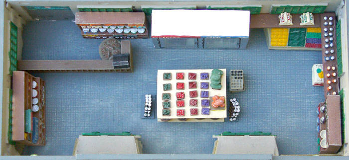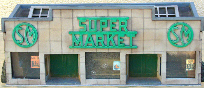 This little gem is one of several mini-markets we've created over the years. As the storefront was tile, the cracks betewwn the various tiles were lined with peat brown ink. Various window signs were photographed from various actual businesses in the area and printed out for our window. Shop Smart The freezer was made of plastic styrene stock, and the shelves filled with model railroad items. It wasn't my intention to have the front part of the freezer so frosted, but the drying hobby glue and dull-coat did it anyway. It turned out better than anything we could have planned. |